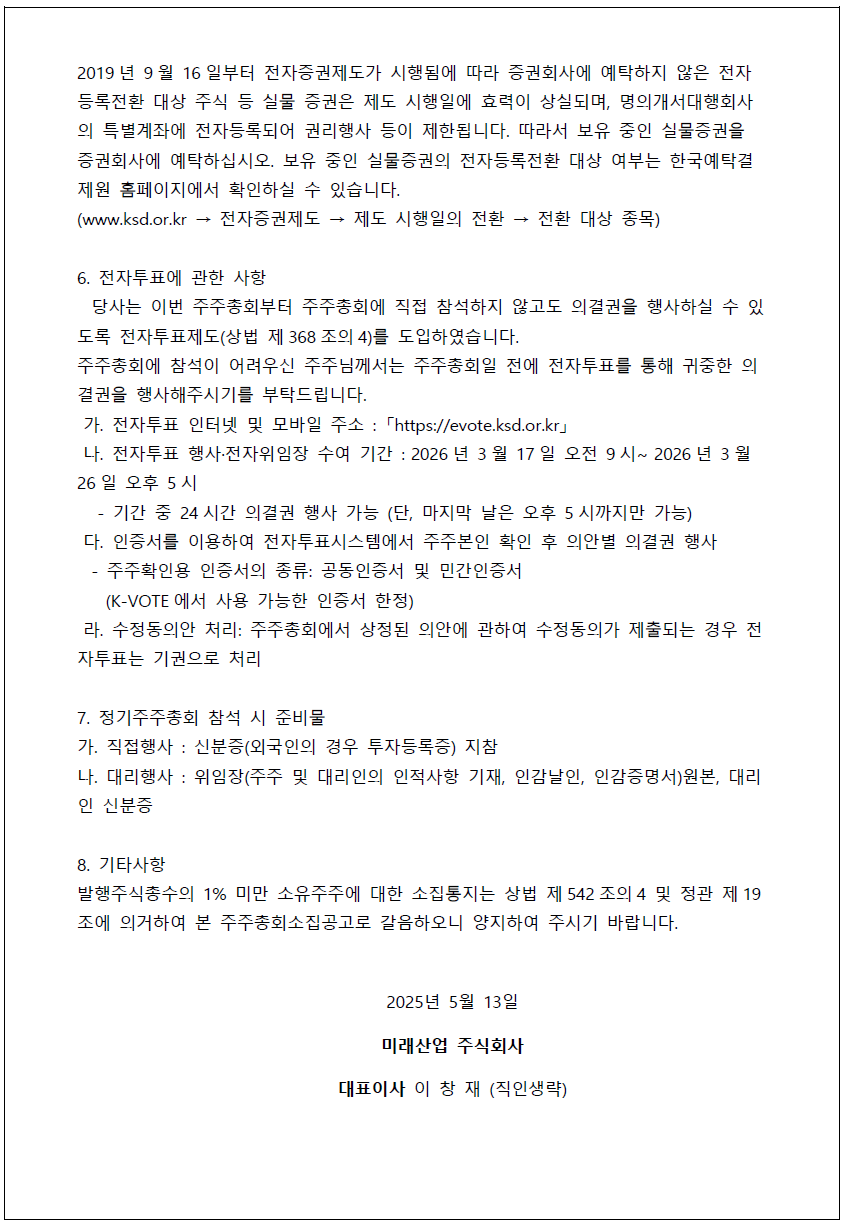 | 2026년도 미래산업㈜ 주주총회 소집공고 | 2026-03-12 | |
