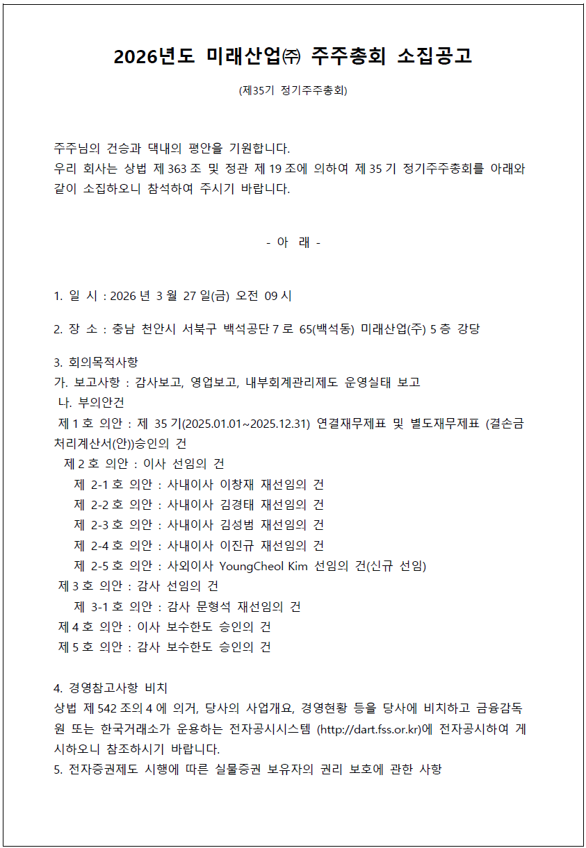 | 2026년도 미래산업㈜ 주주총회 소집공고 | 2026-03-12 | |